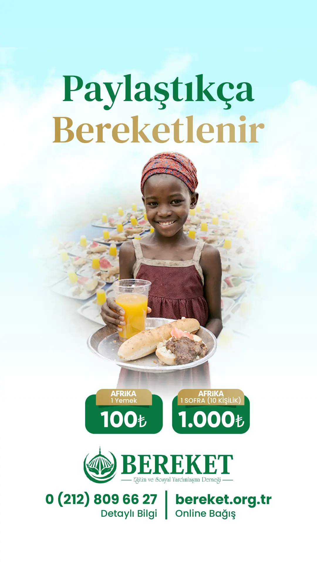 Bereket Derneği, sizlerden aldığı güç ve destekler ile kilometrelerce uzakta, yoksulluk ve sıkıntılarla boğuşan Afrika’nın en yoksul ülkelerinde yemek sofraları kuruyor. Yıllardır insani yardım faaliyetlerini sürdüren Bereket Derneği, insani yardım çalışmaları kapsamında yeni bir projeyi hayata geçiriyor; “Afrika yemek bağışı”