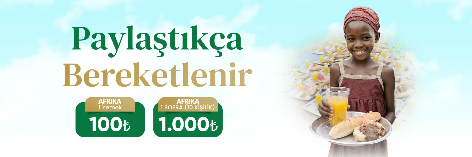 Ramazan paylaşmaktır, kardeşliğimizin pekiştiği veren ve alan elin kenetlendiği manevi bir iklim olan Ramazan ayı boyunca Afrika iftar yemeği organizasyonu kapsamında İftar sofraları kuruyoruz. Sizde bir iftar bedeli 100 Tl ile kilometrelerce uzaktaki bir kardeşinizin iftar sofrasını kurabilirsiniz.